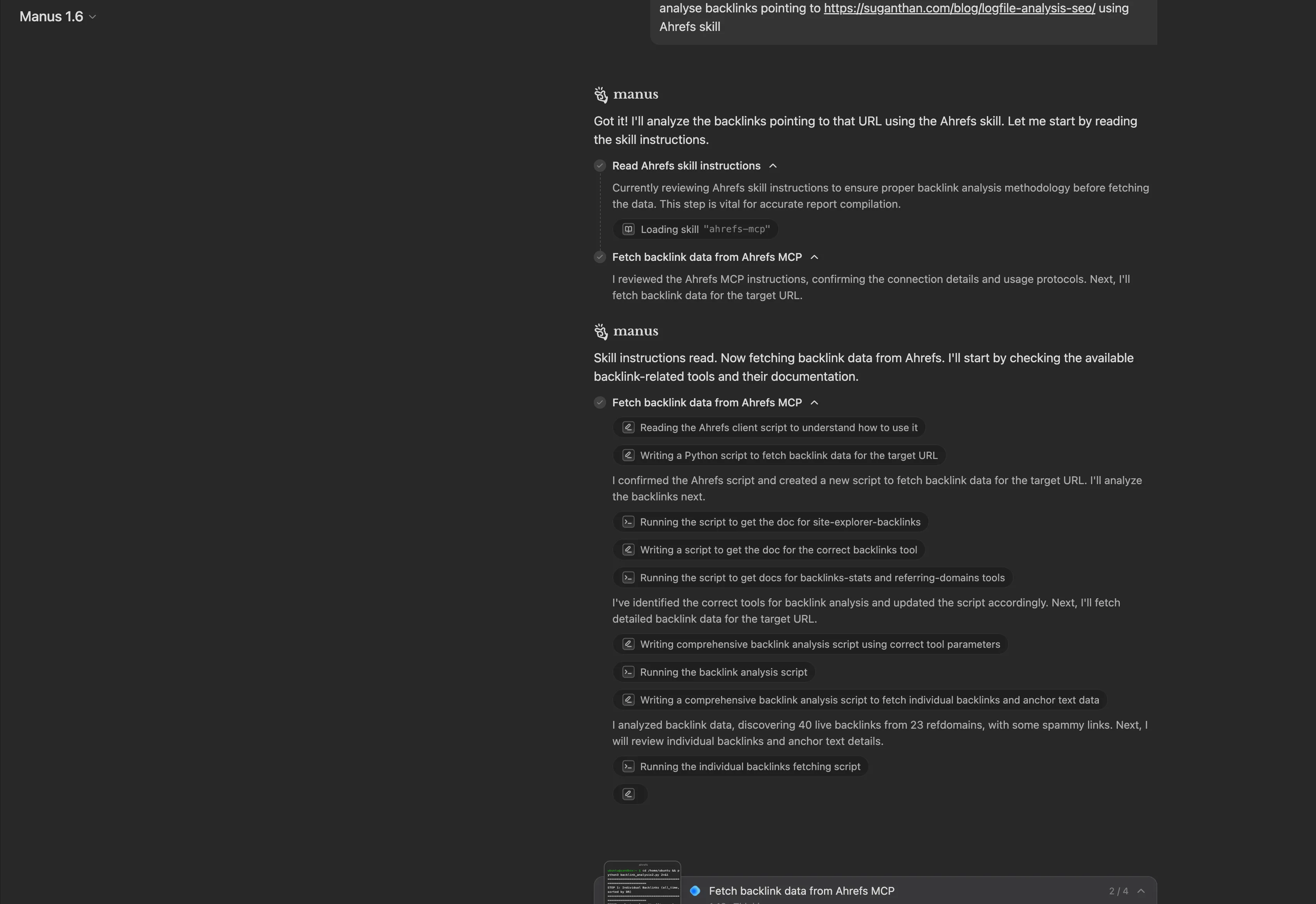 In the meantime, the skill in this post bypasses the proxy by calling the Ahrefs MCP server directly via Python. It takes about five minutes to set up, and once it’s in place, Manus uses it automatically for any task that involves Ahrefs data.