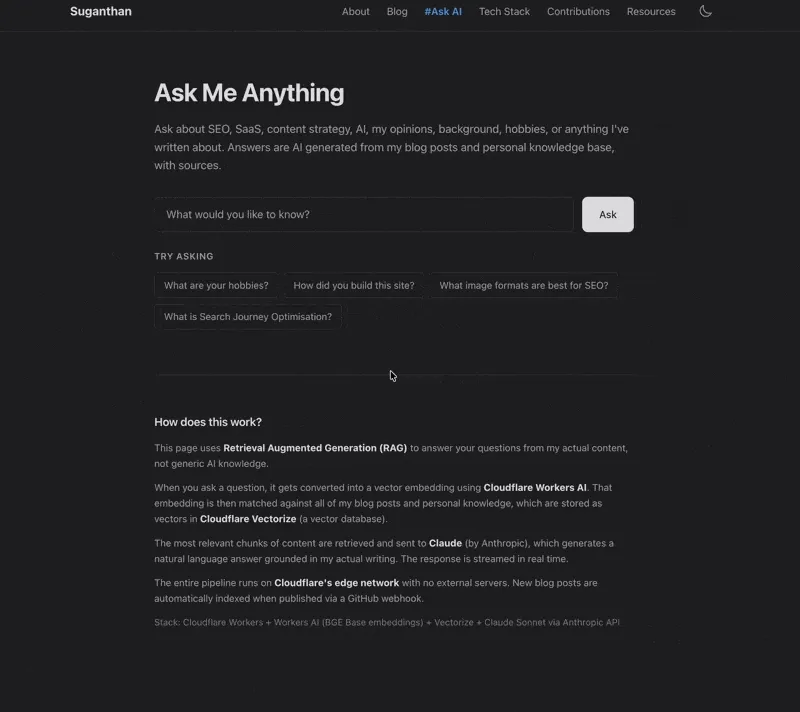 Everything runs on Cloudflare’s edge except the final answer generation, which calls Anthropic’s API. No external databases, no Lambda functions, no containers. The entire RAG pipeline lives inside my existing Cloudflare Worker.