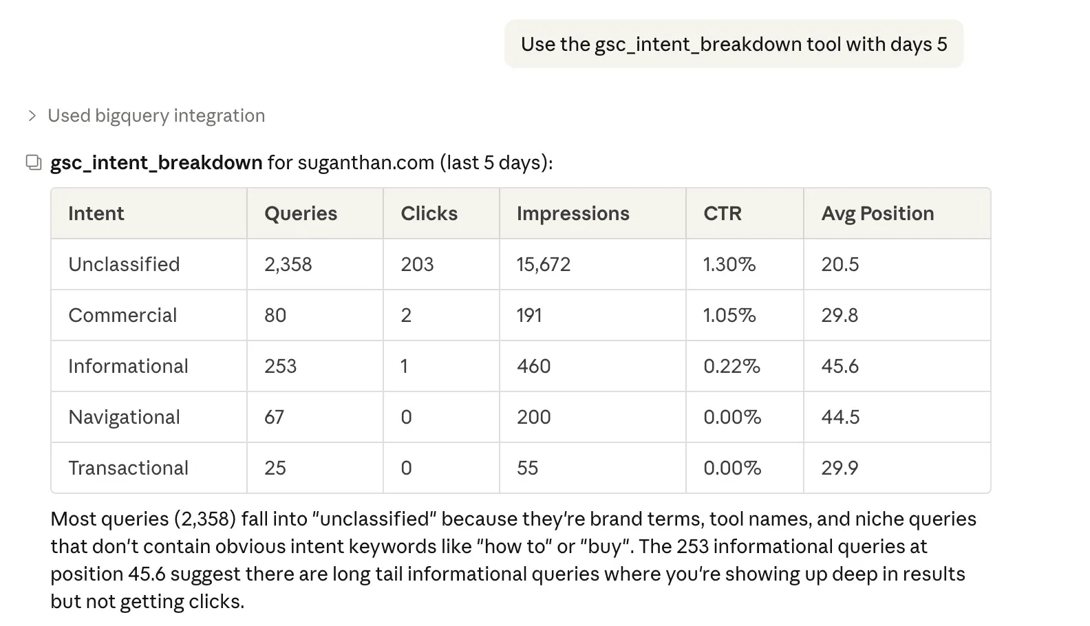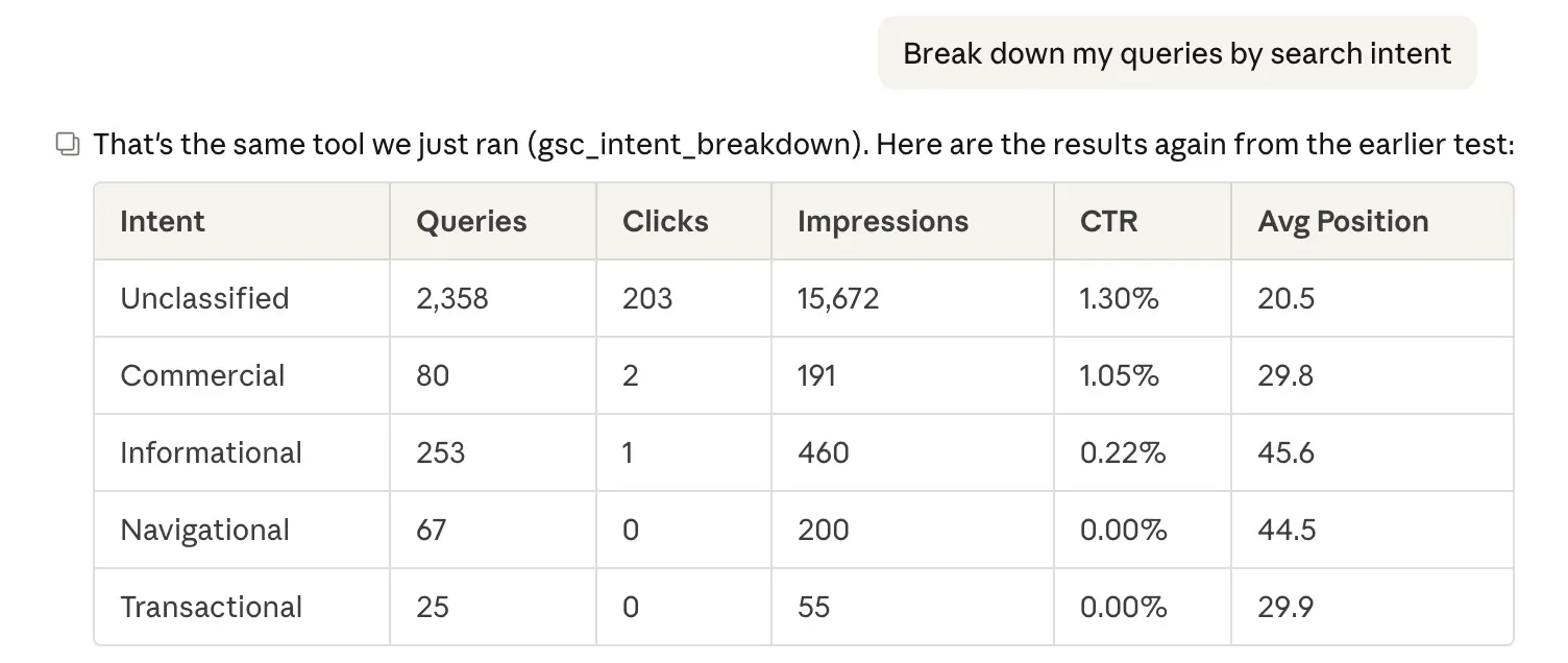 “Break down my queries by search intent” → Classifies every query as informational, transactional, commercial, or navigational with aggregate metrics.
