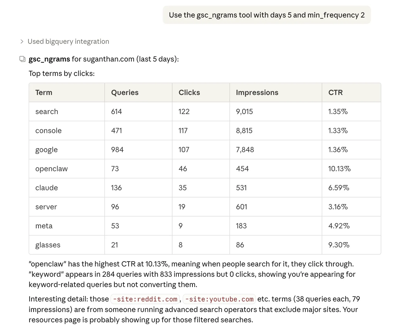 The gsc_ngrams tool extracts individual terms from all your queries using UNNEST(SPLIT()), then aggregates them by frequency. It shows which words appear most often across your query set, along with total clicks and impressions for queries containing that term.