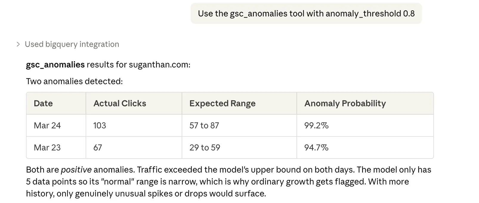 The gsc_anomalies tool builds the same ARIMA model but uses it to detect anomalies rather than forecast. It runs ML.DETECT_ANOMALIES across your historical data and flags any data points where traffic deviated significantly from the expected pattern.