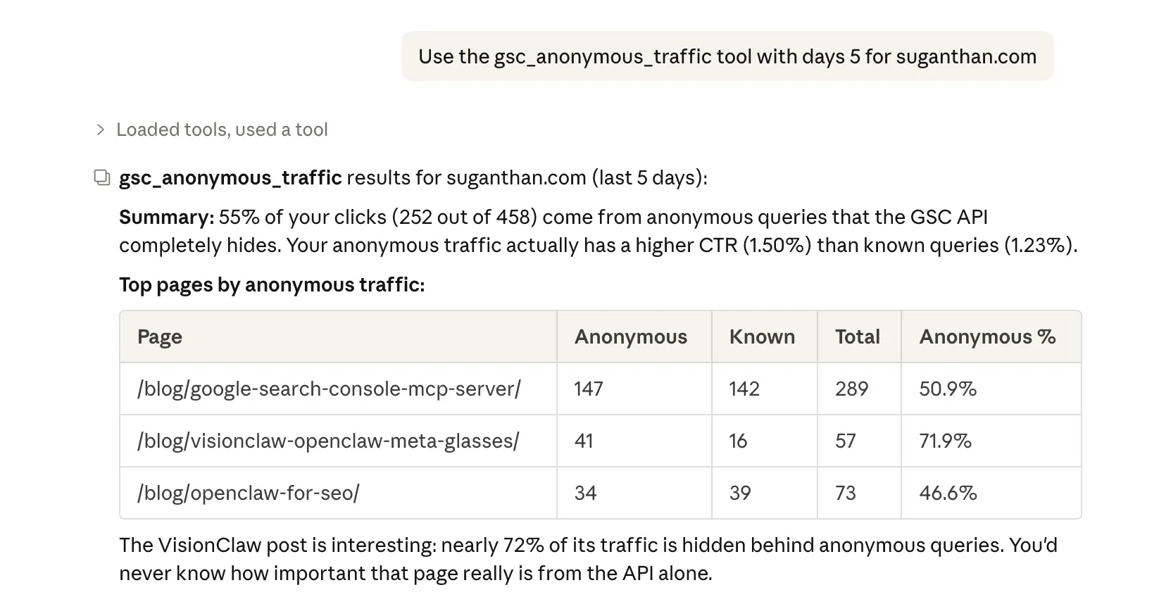 To be clear: BigQuery doesn’t de-anonymise these queries. Nobody can. What it does give you is the is_anonymized_query = true flag on every row, which the API strips entirely. The gsc_anonymous_traffic tool uses this to show you the gap per URL between total clicks and query-attributed clicks, so you can see which pages have the most “dark” traffic.