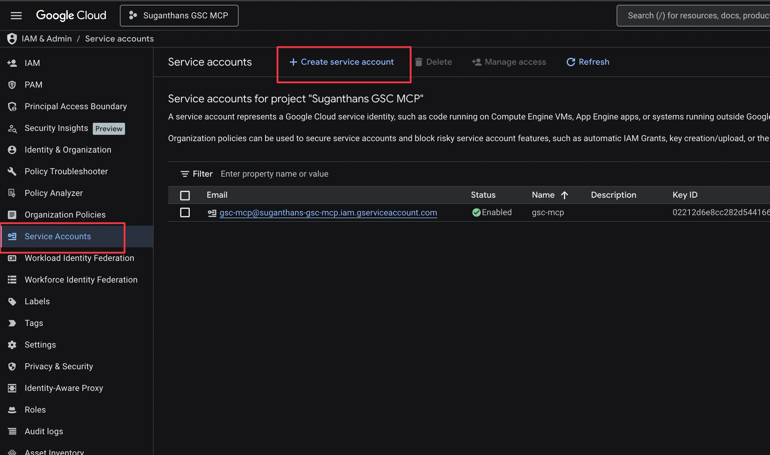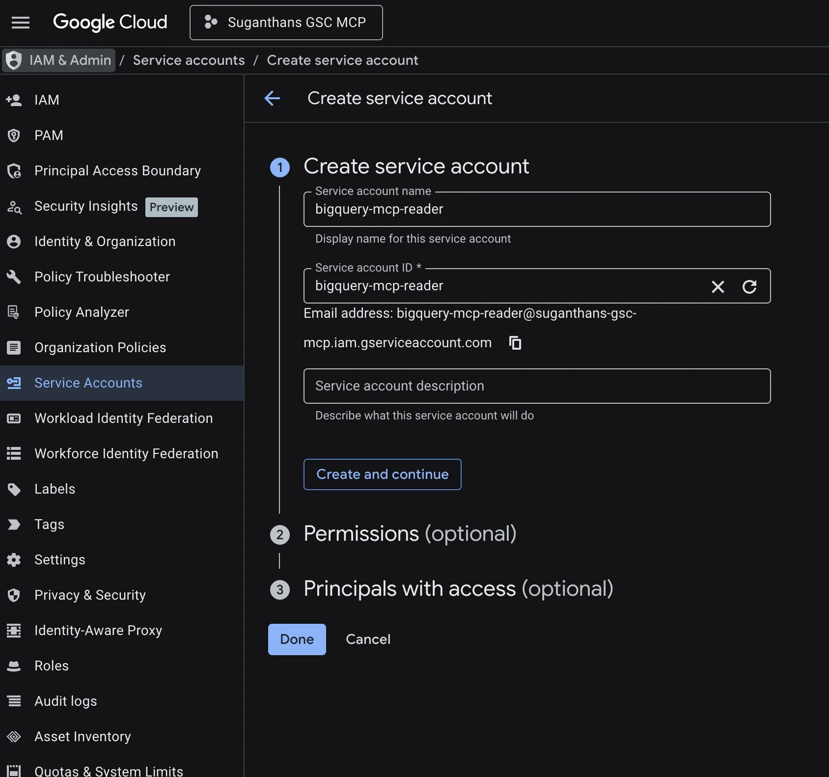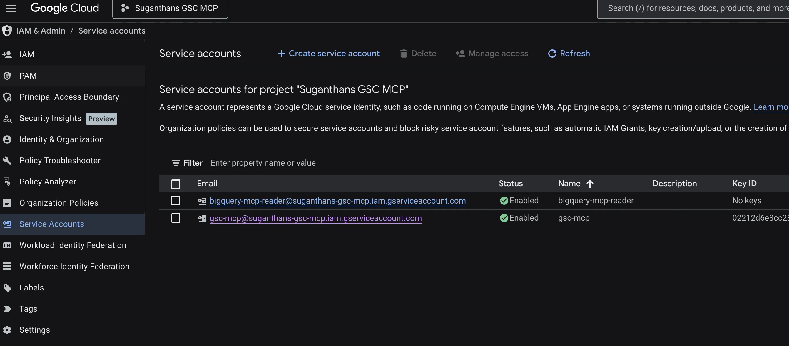 This is not the same service account from earlier. The export service account (search-console-data-export@system.gserviceaccount.com) is owned by Google and writes data into BigQuery. This new one is yours. Different account, different permissions, different purpose.