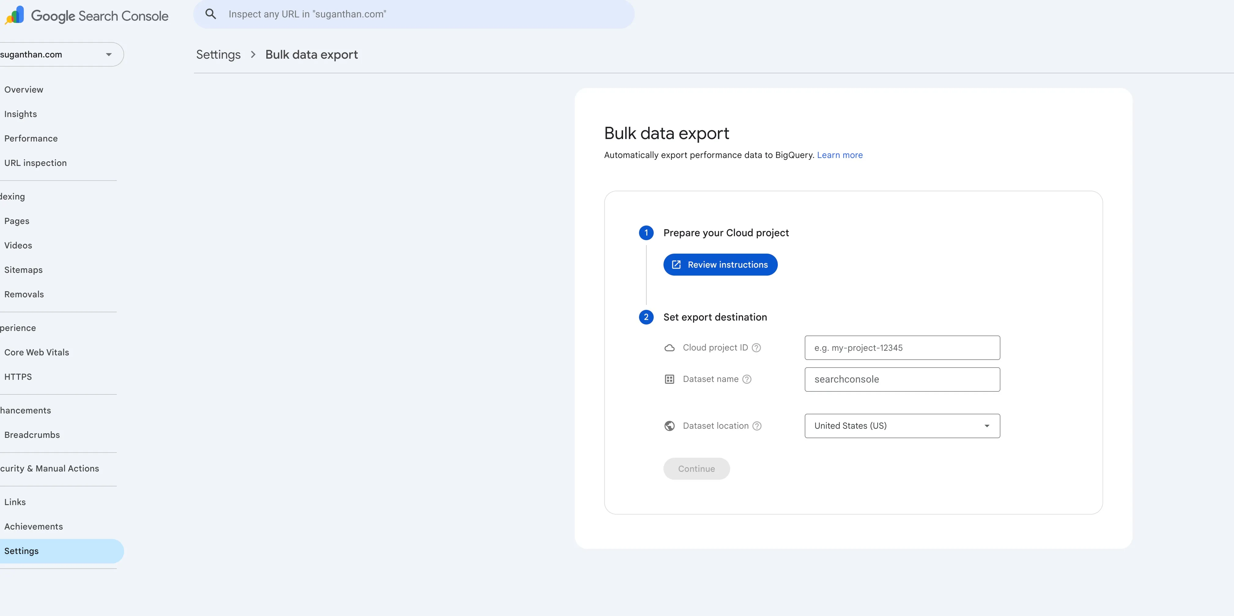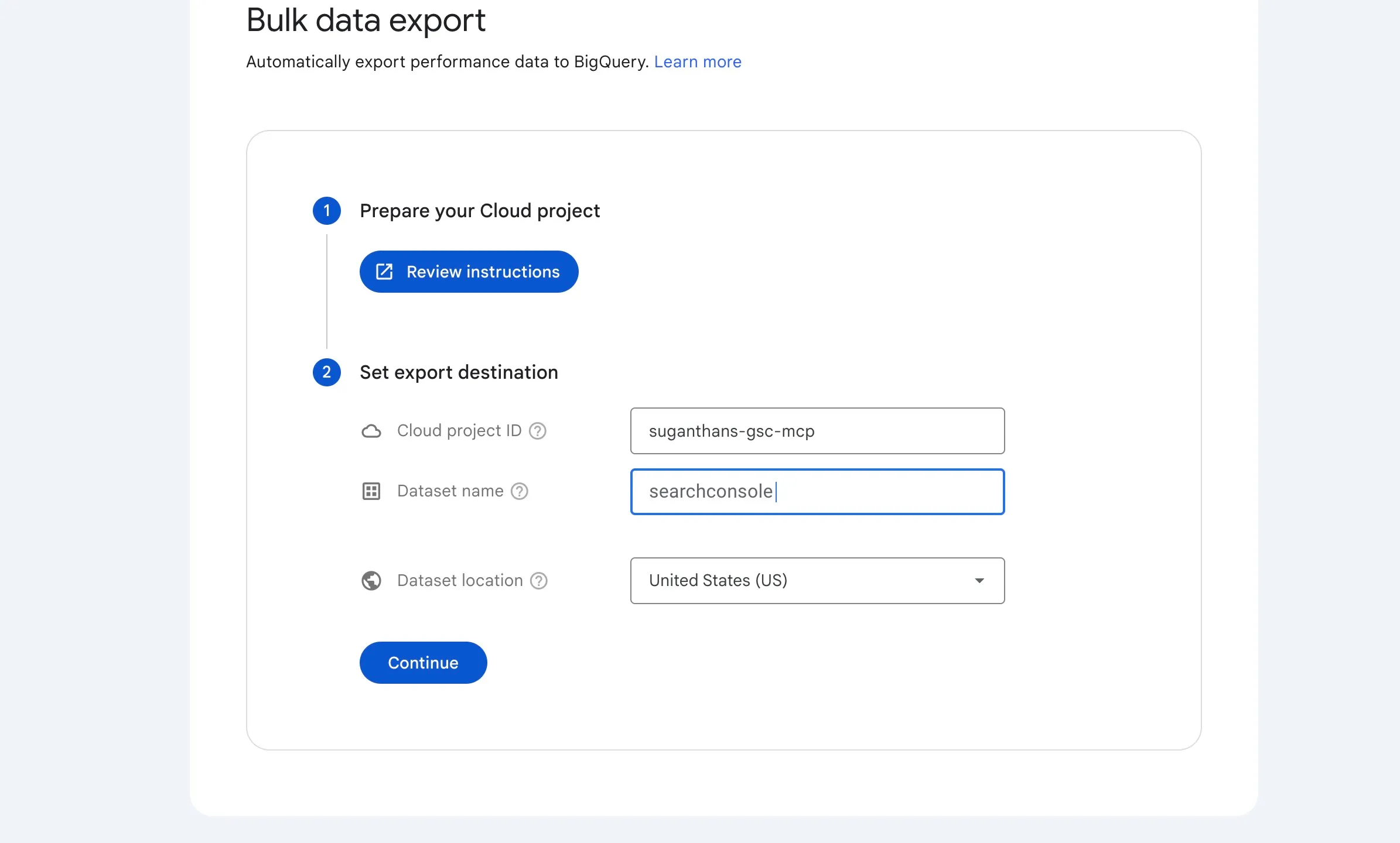 Wizard step 2: Set export destination. Enter your Cloud project ID, a dataset name (e.g. searchconsole), and a dataset location (US works for most people).