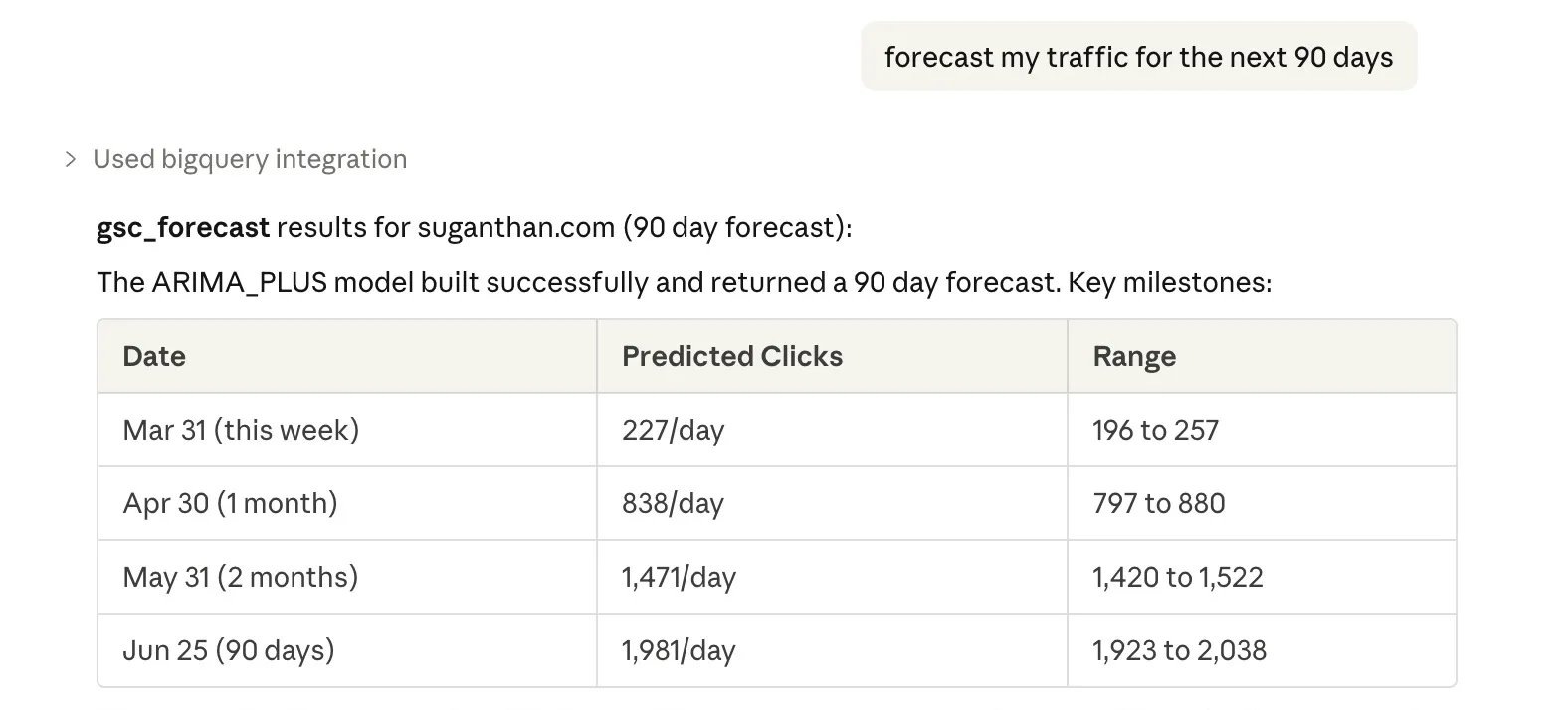 “Forecast my traffic for the next 90 days” → Builds an ARIMA_PLUS model on your historical data and returns daily predicted clicks with upper and lower bounds.
