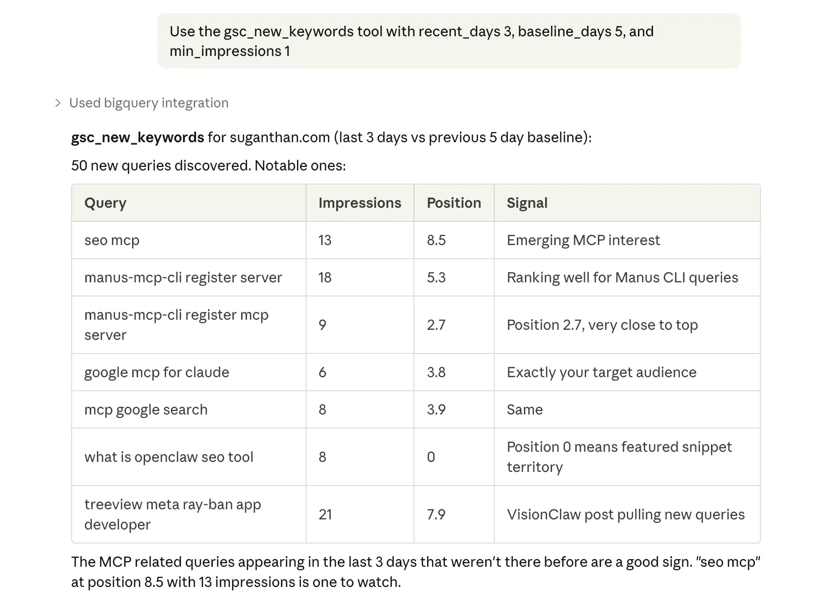 “What new keywords appeared this week?” → Finds queries in your recent data that weren’t present in the baseline period.