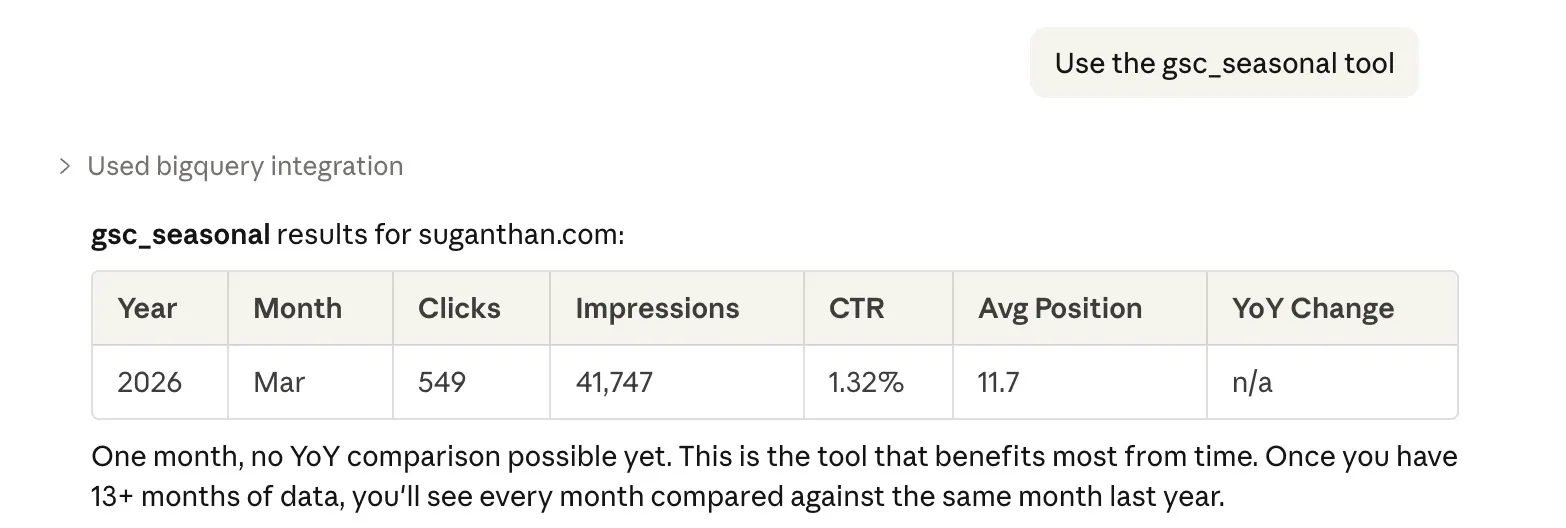 The gsc_seasonal tool does what every SEO should do but rarely does properly. Year over year monthly comparison. It aggregates clicks, impressions, CTR, and position by month, then calculates YoY change percentages using window functions.