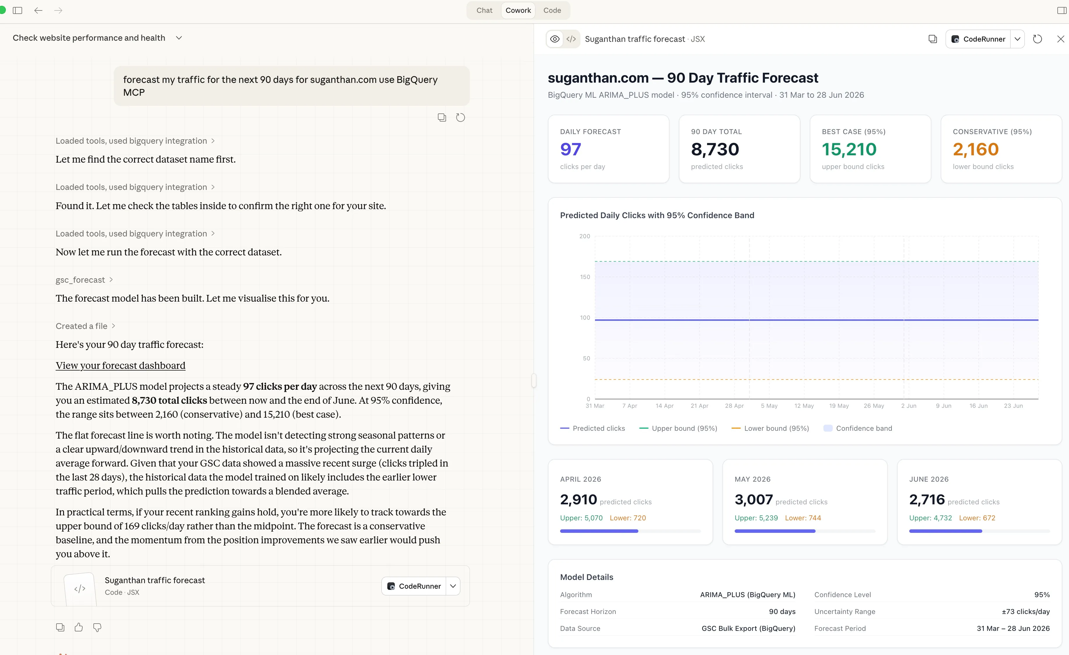 Claude thinks for a moment, builds an ARIMA model on your BigQuery data, runs the forecast, and hands you a table of predicted daily clicks with confidence intervals.