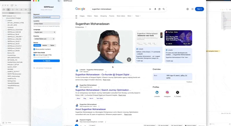 “I want to build a macOS app that has a sidebar with input fields for a keyword and a location dropdown. When I click Search, it should call the ValueSERPs API and display the Google search results in the main content area, rendered to look like an actual Google SERP.”