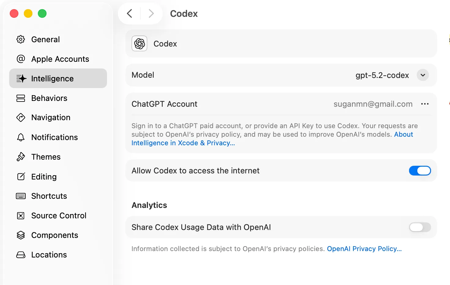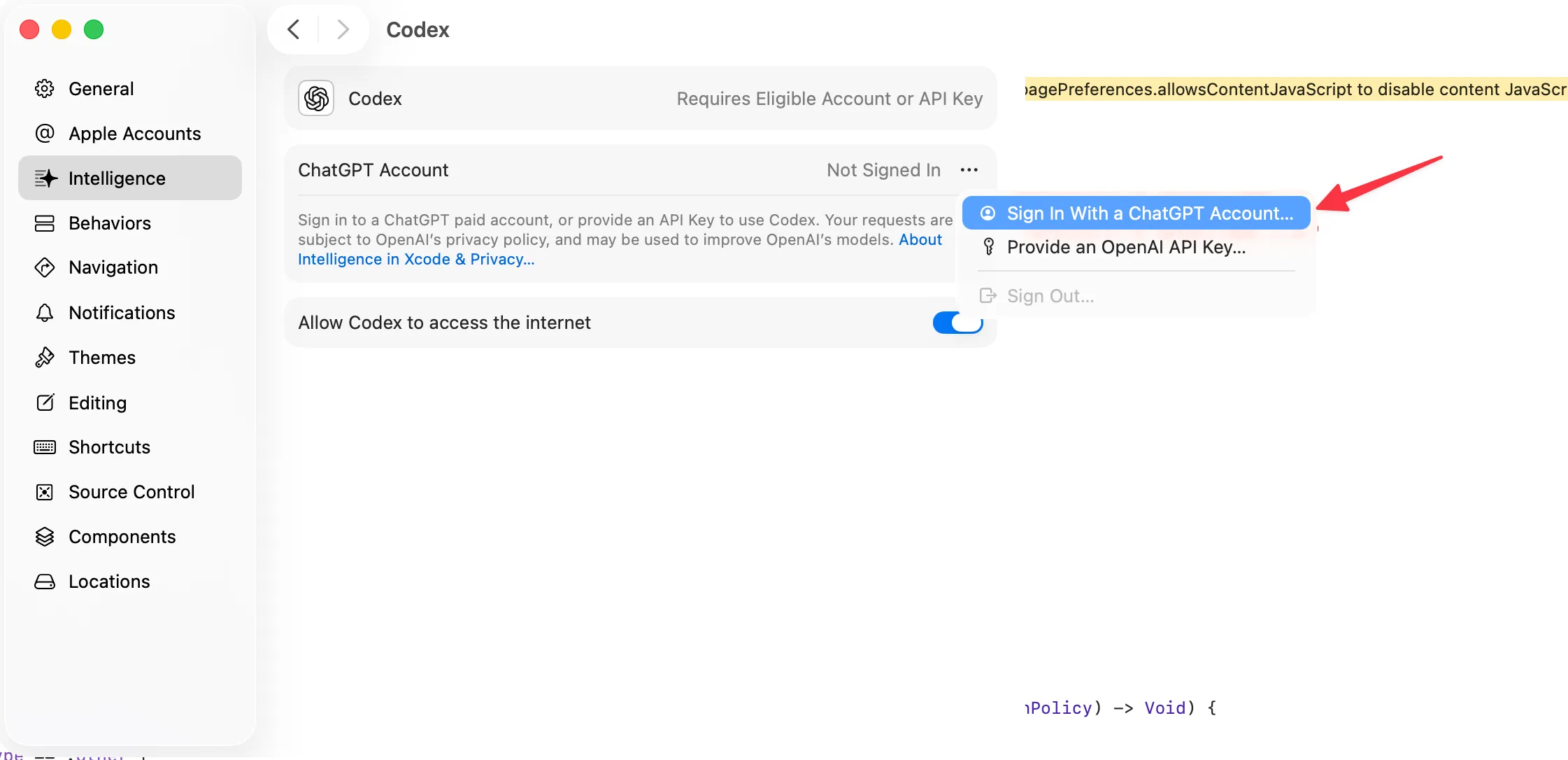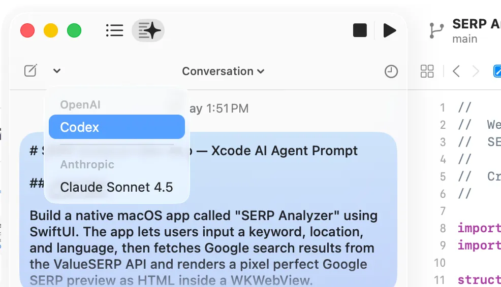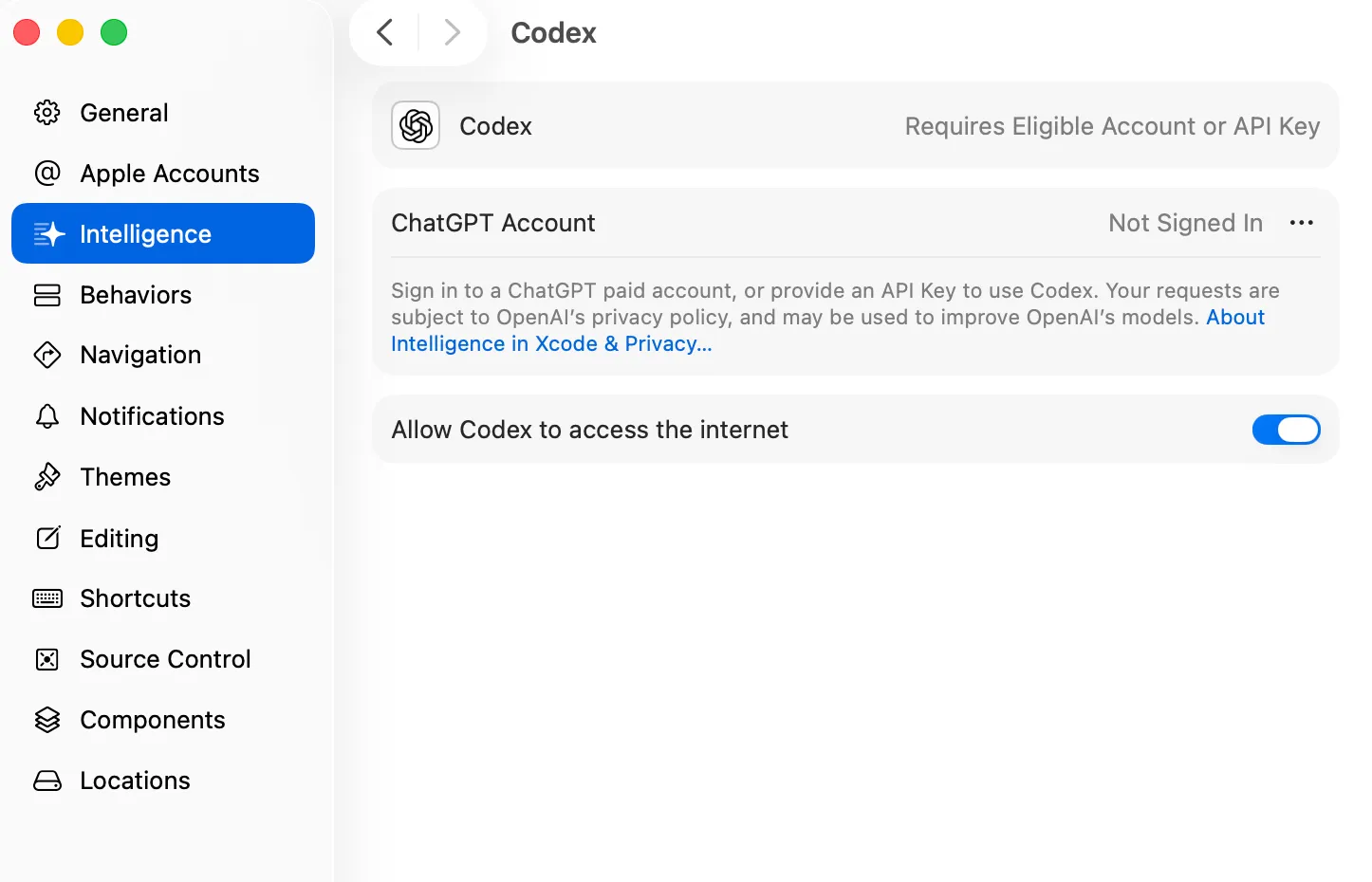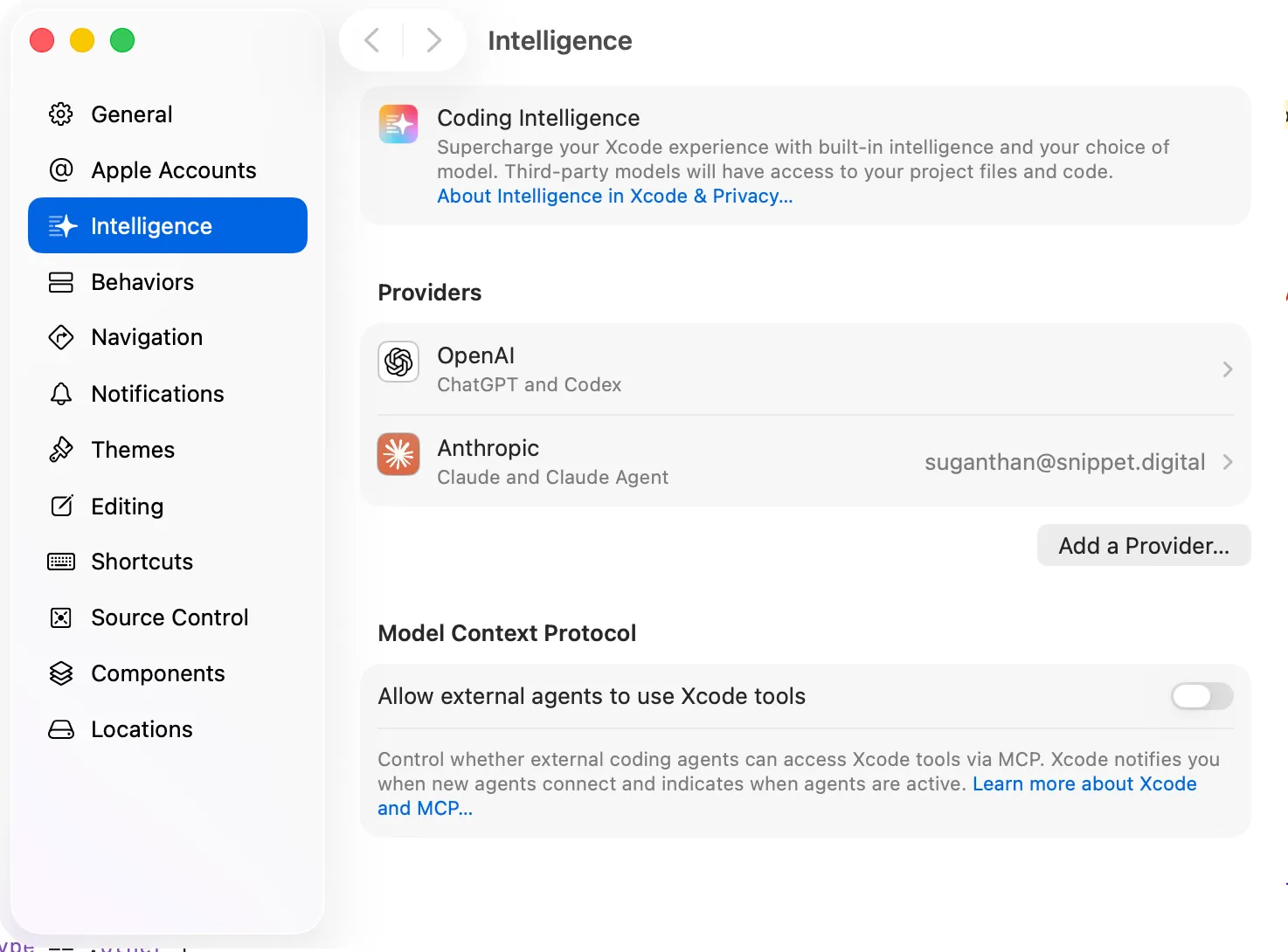 This is the bit that makes everything possible. Xcode 26.3 has native support for AI coding agents built right in. No extensions to install. No terminal commands. Just a settings toggle.
