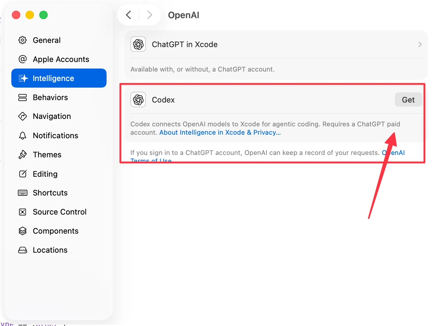 After you install Xcode, you will see a prompt to install coding intelligence (Often it starts automatically)