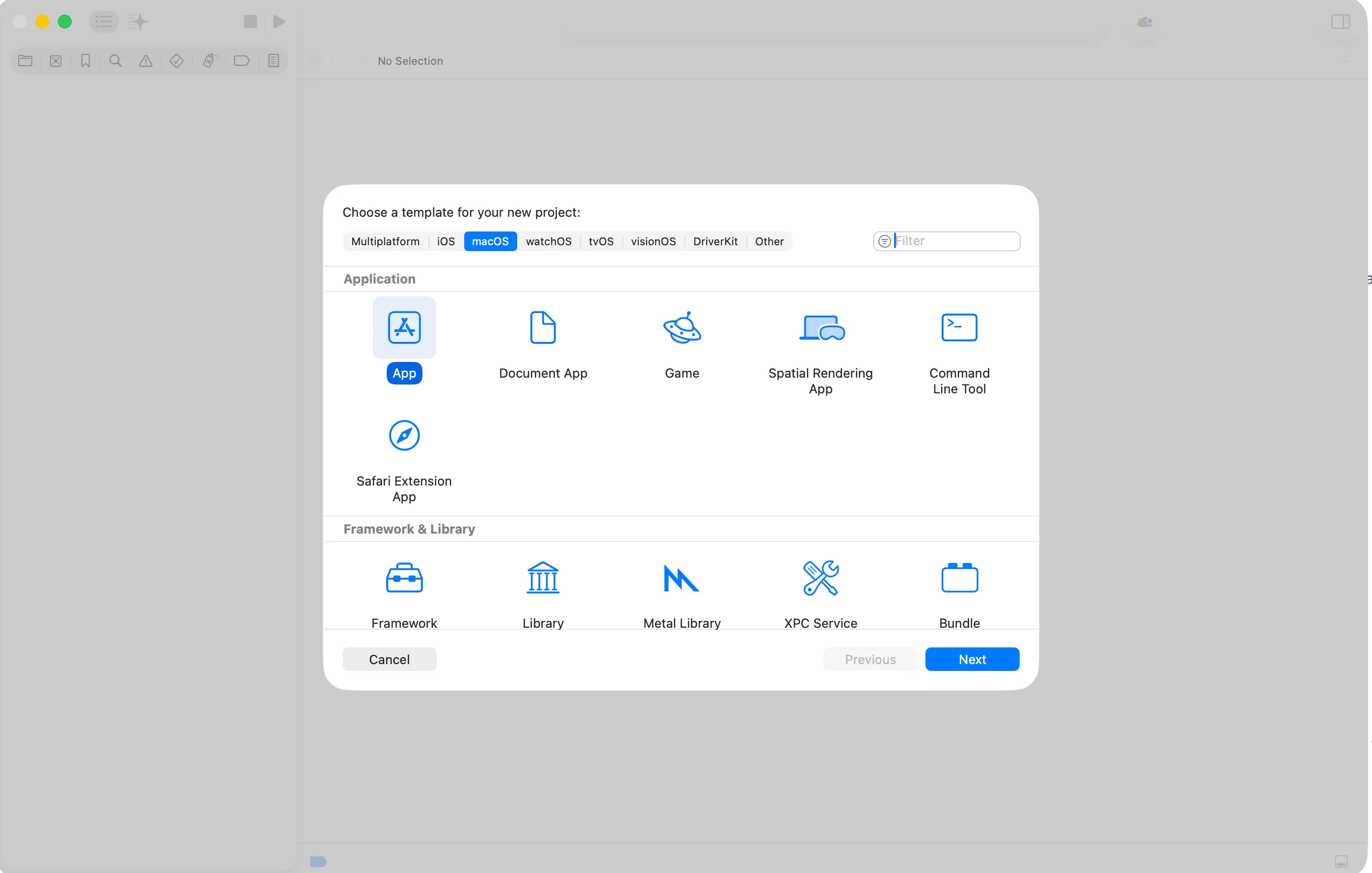 - Choose macOS > App (or iOS > App if you want to build for iPhone/iPad)