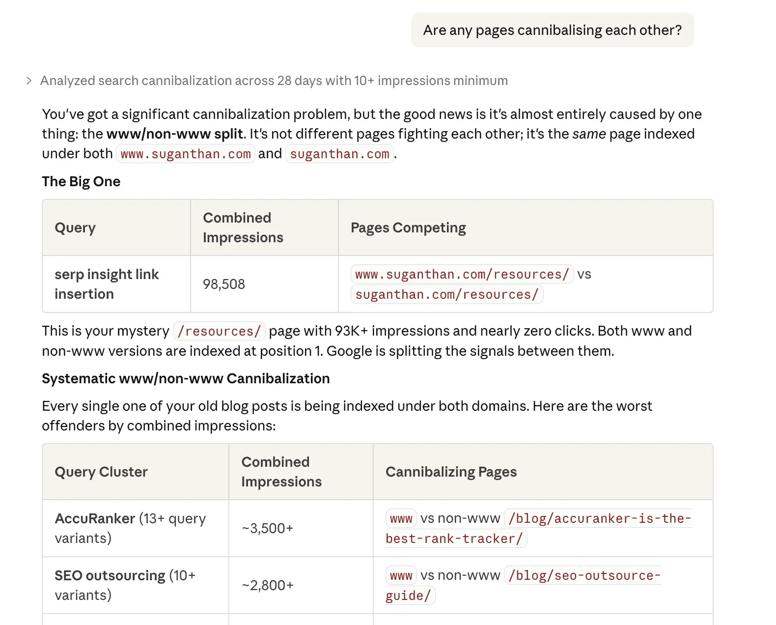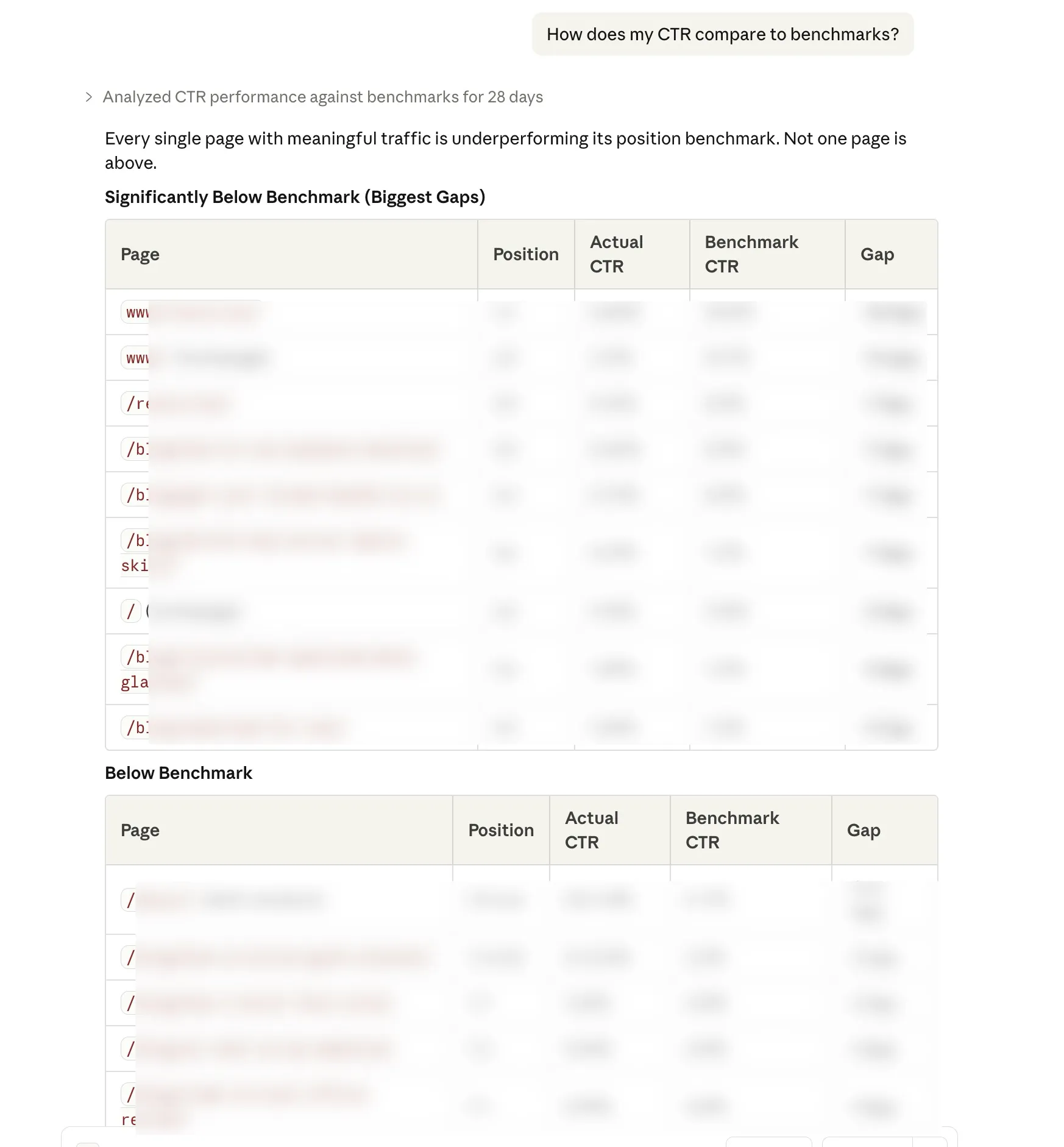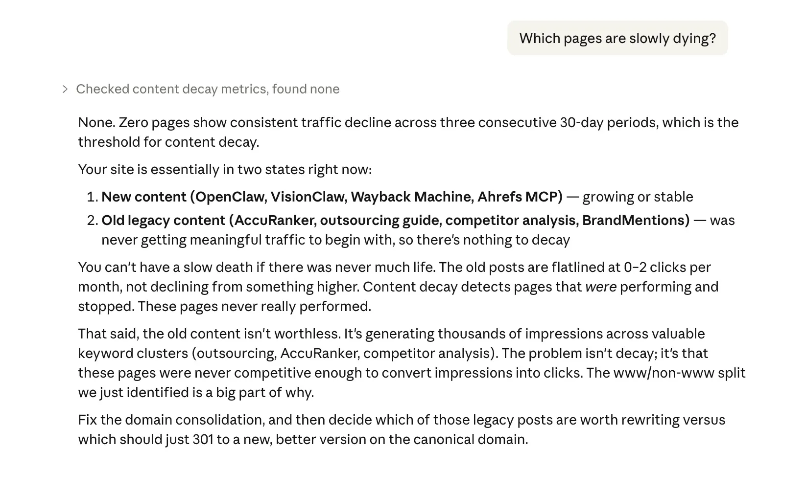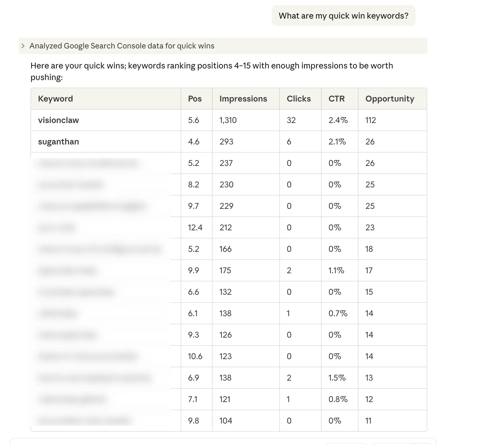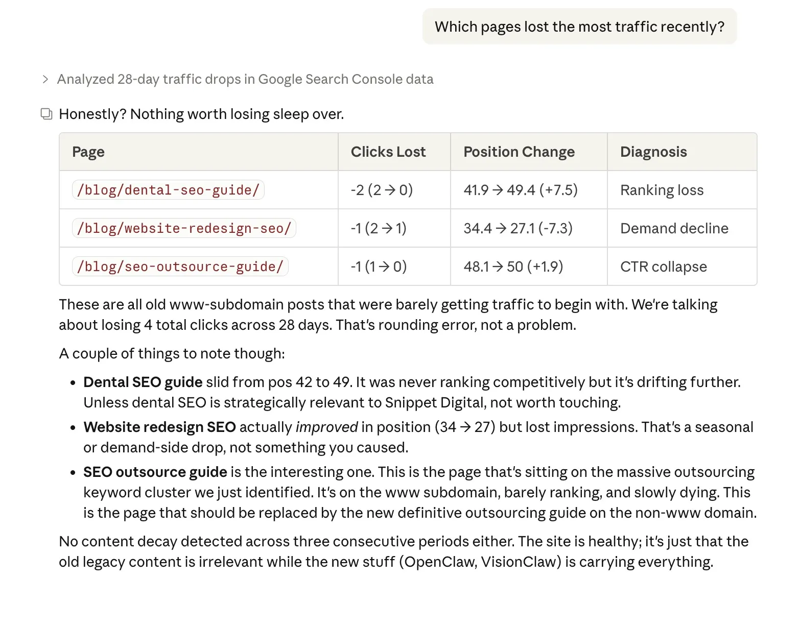 And because it’s Claude, you’re not limited to these ten. You can ask follow up questions. “Show me only the quick wins with more than 1,000 impressions.” “Which of those decaying pages are blog posts?” Claude understands context.