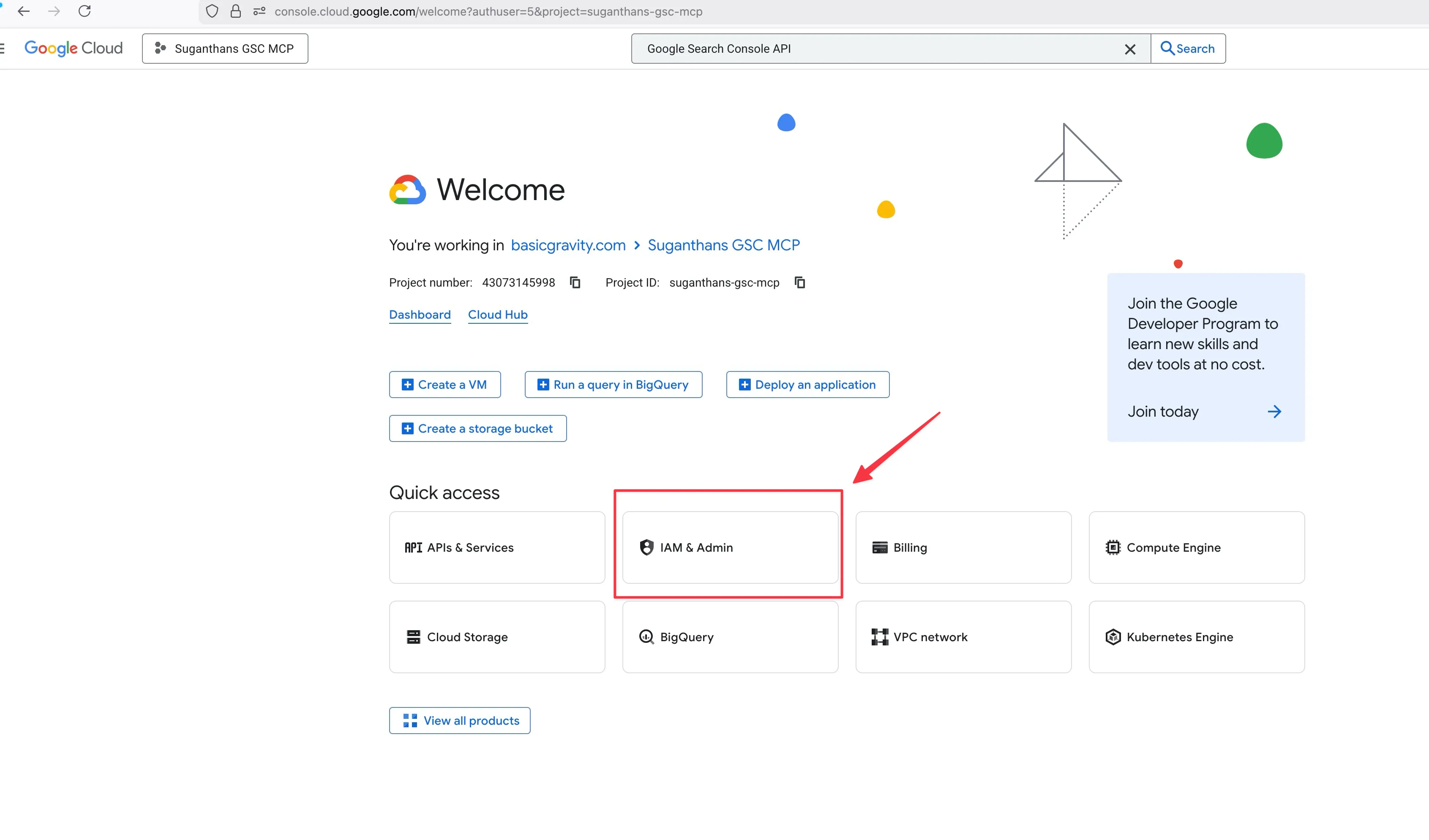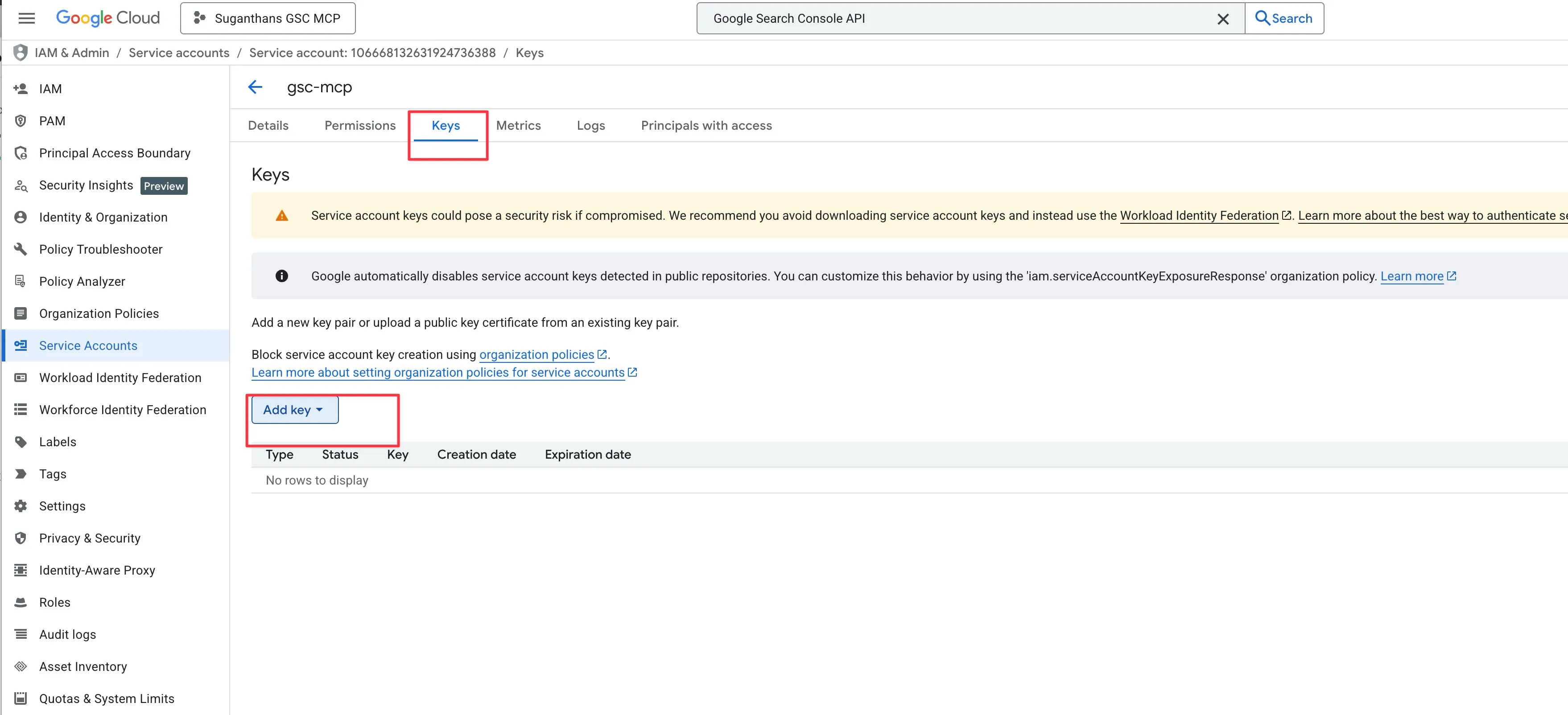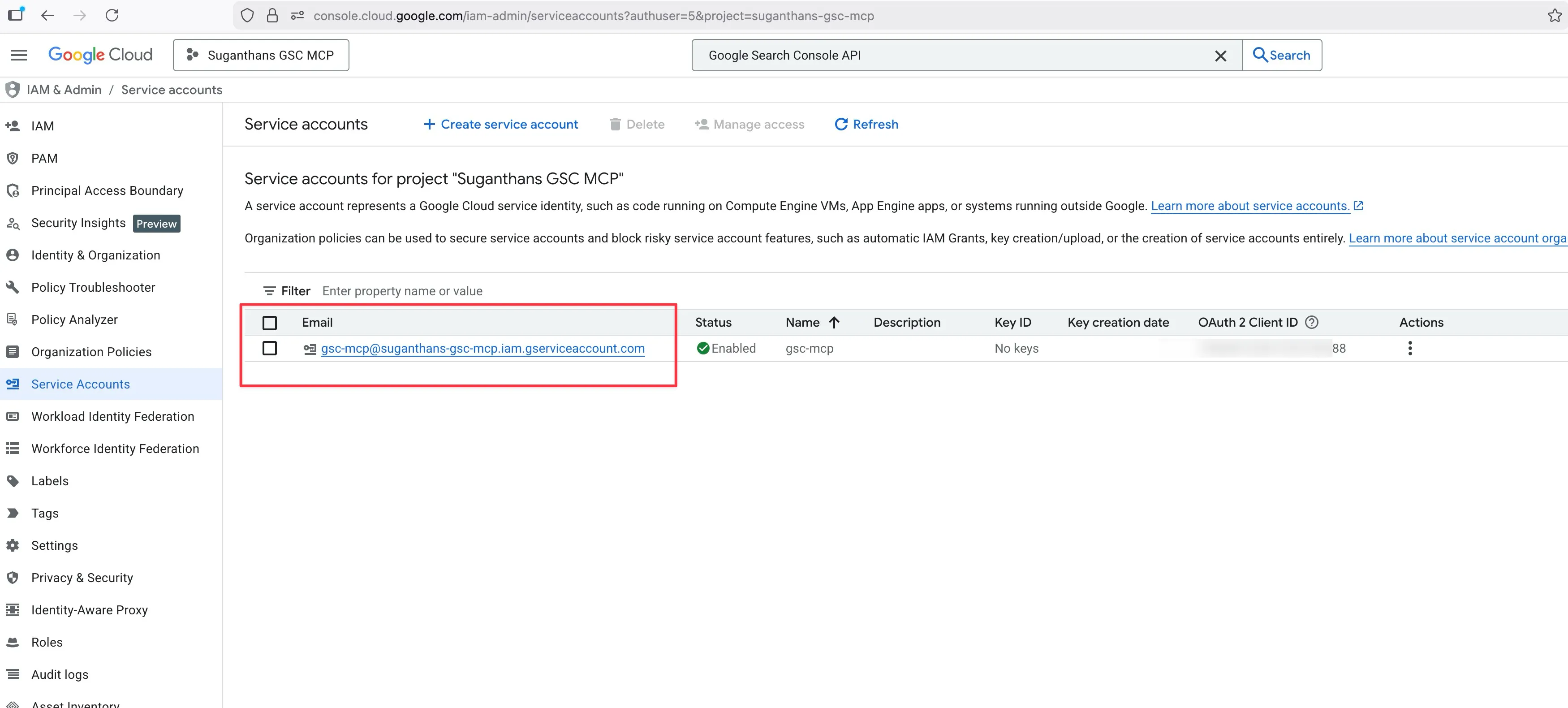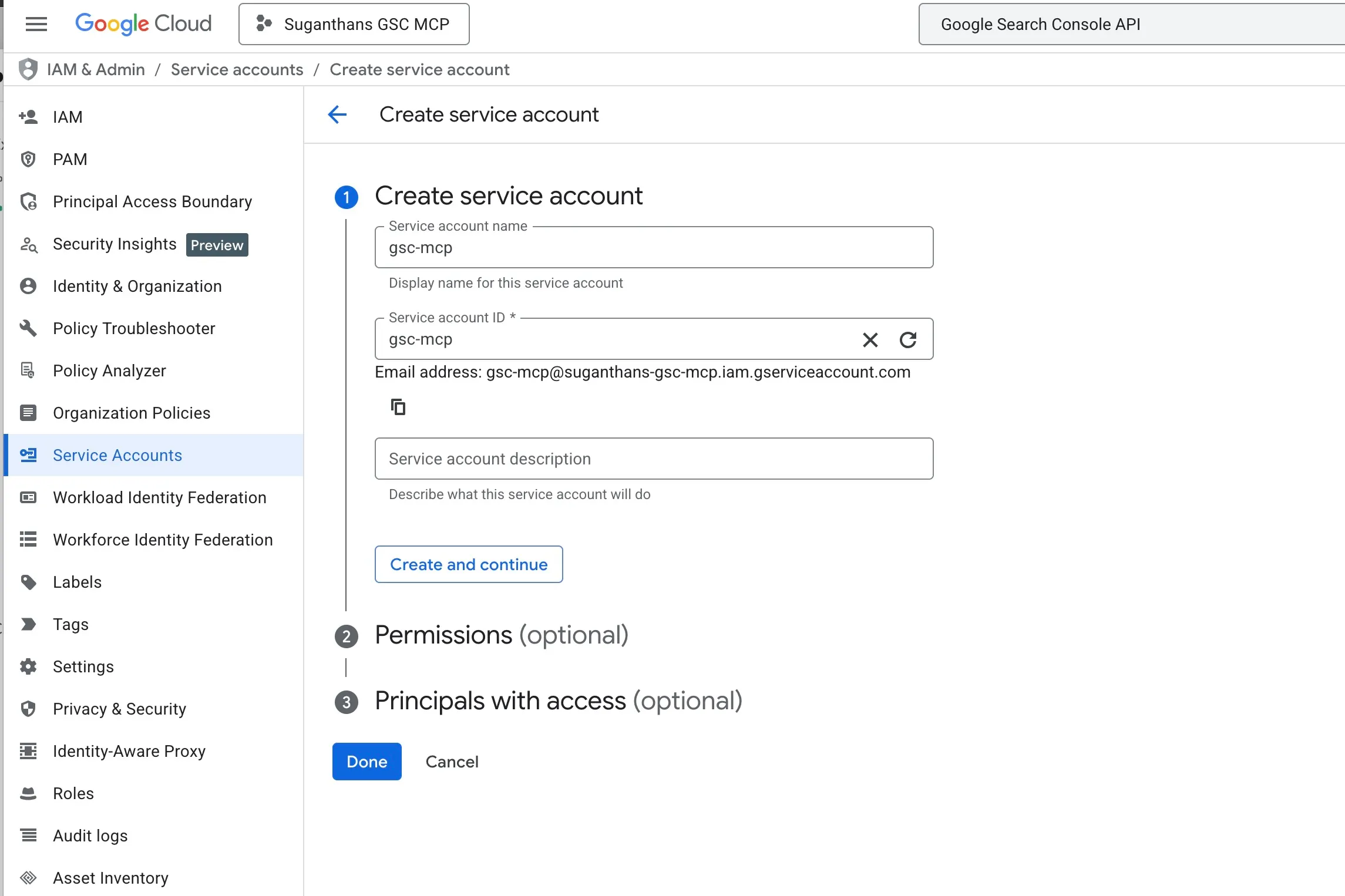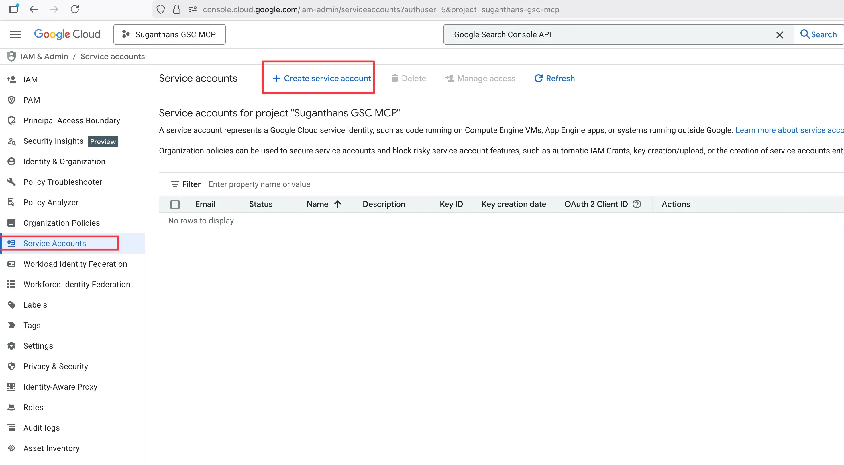 A service account is like a robot user that the MCP server uses to log in to your Search Console. It’s not your personal Google account; it’s a separate identity just for this purpose.