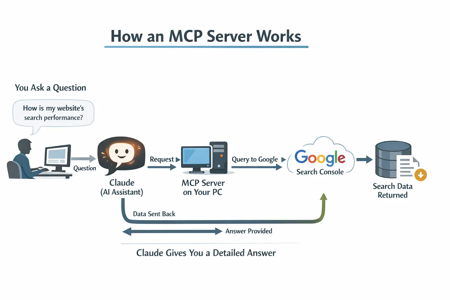 A Google Search Console MCP server is a small programme that runs on your computer. When you ask Claude a question about your website’s search performance, Claude talks to this programme, which talks to Google, which sends back the data, and Claude turns it into a human answer.