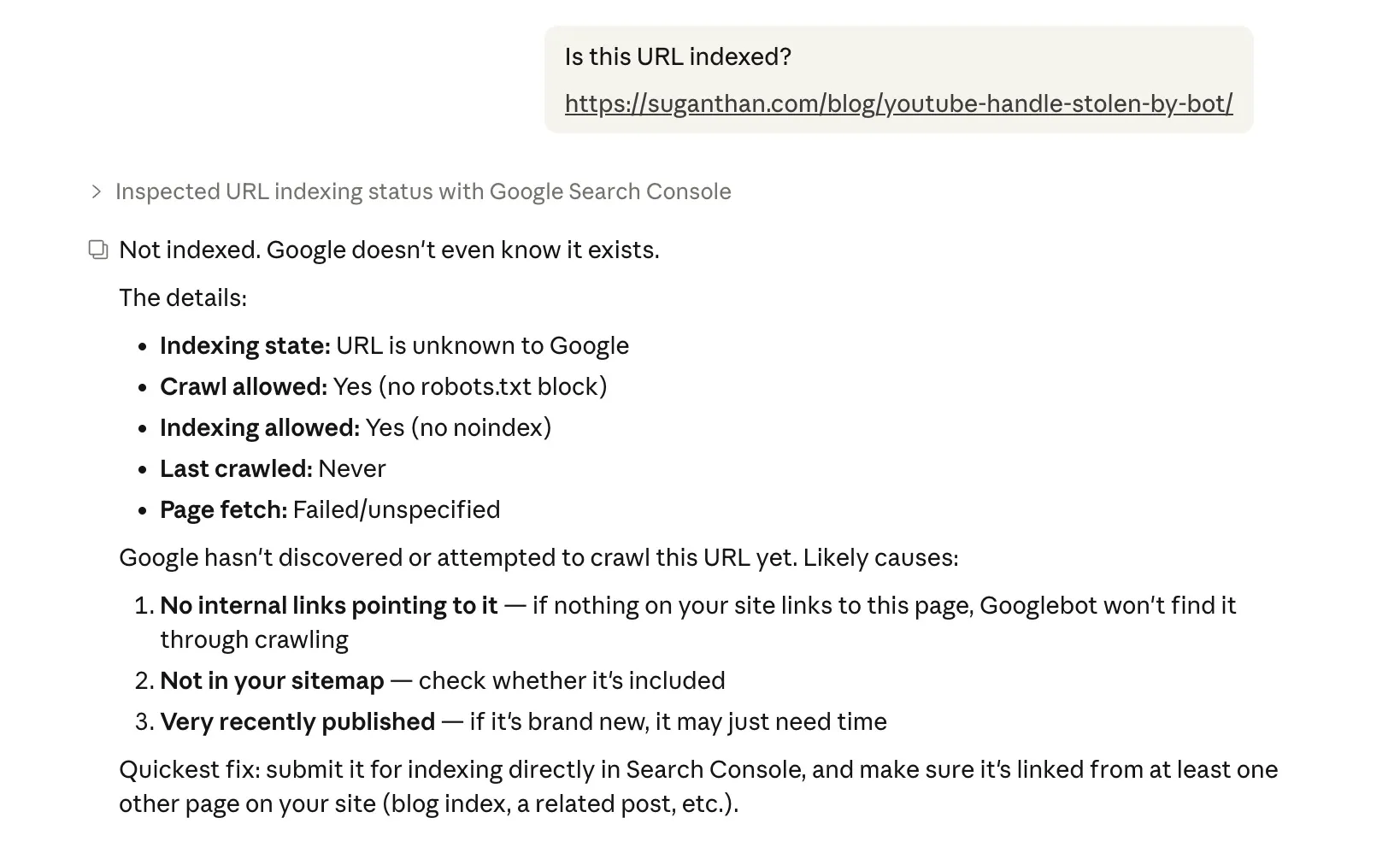 Checks a specific URL’s indexing status, including when Google last crawled it, any canonical issues, robots.txt blocks, noindex tags, and mobile usability. The kind of thing you’d use the URL Inspection tool for, but without leaving your conversation.