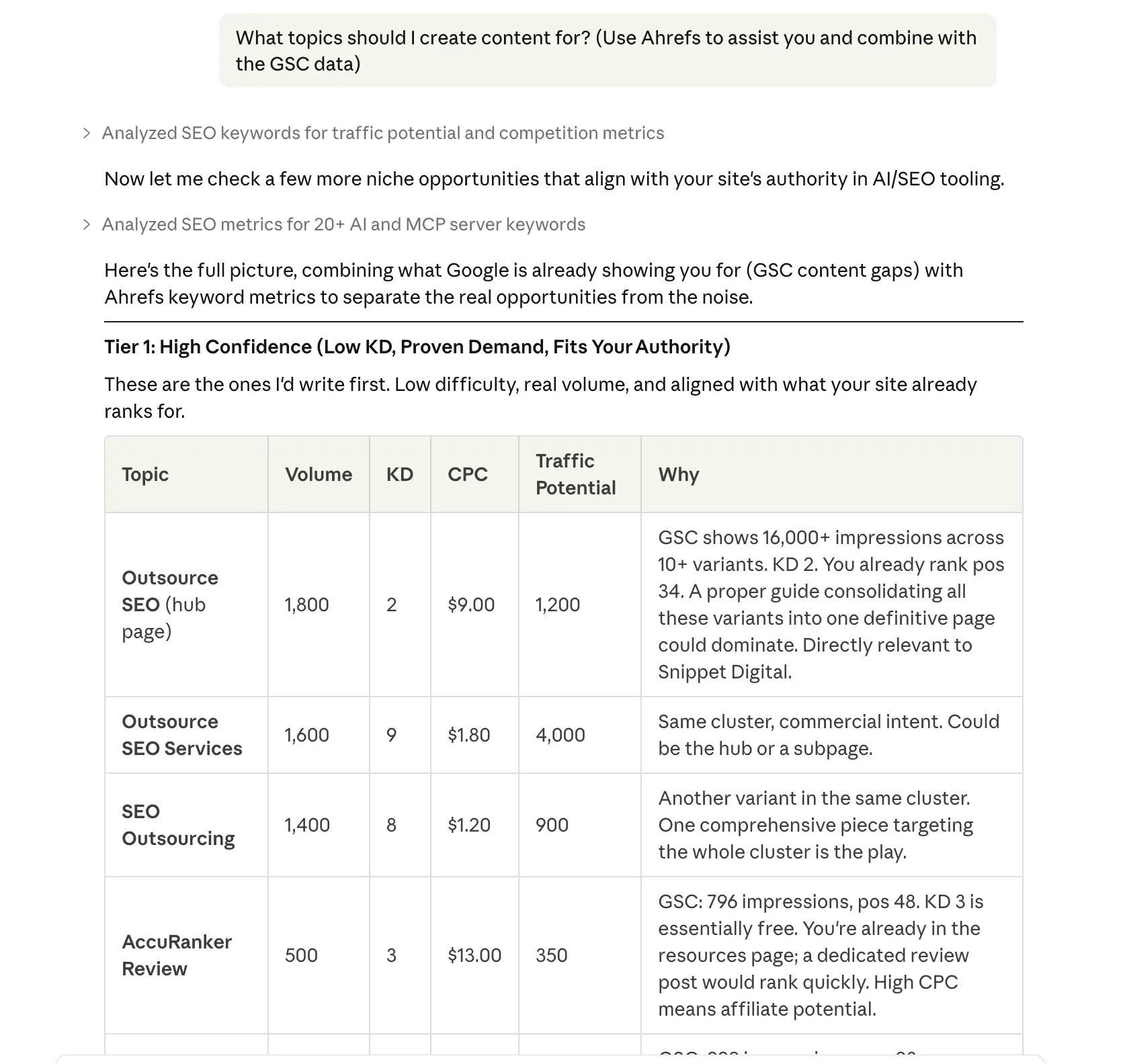 The beauty of this is you can also combine data with other tools. In this example I have asked Claude to pull the GSC data and then combine it with Ahrefs