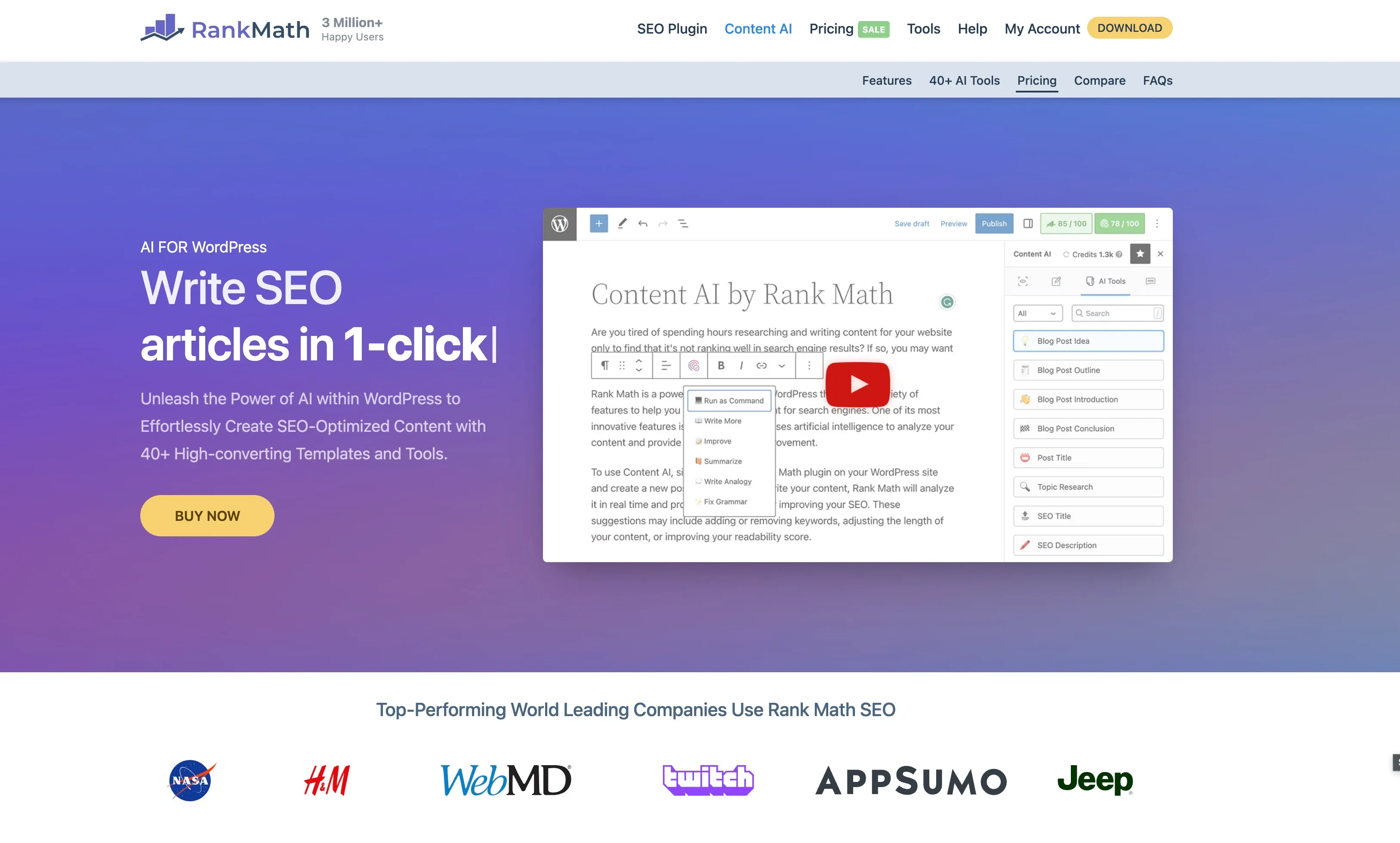 Rank Math now has 40+ AI writing tools built into the WordPress editor. You can generate blog post ideas, outlines, introductions, meta descriptions, FAQ sections, and even full articles with a click. There is also a RankBot, which is essentially a 24/7 AI assistant that answers SEO questions using 125+ curated prompt templates.