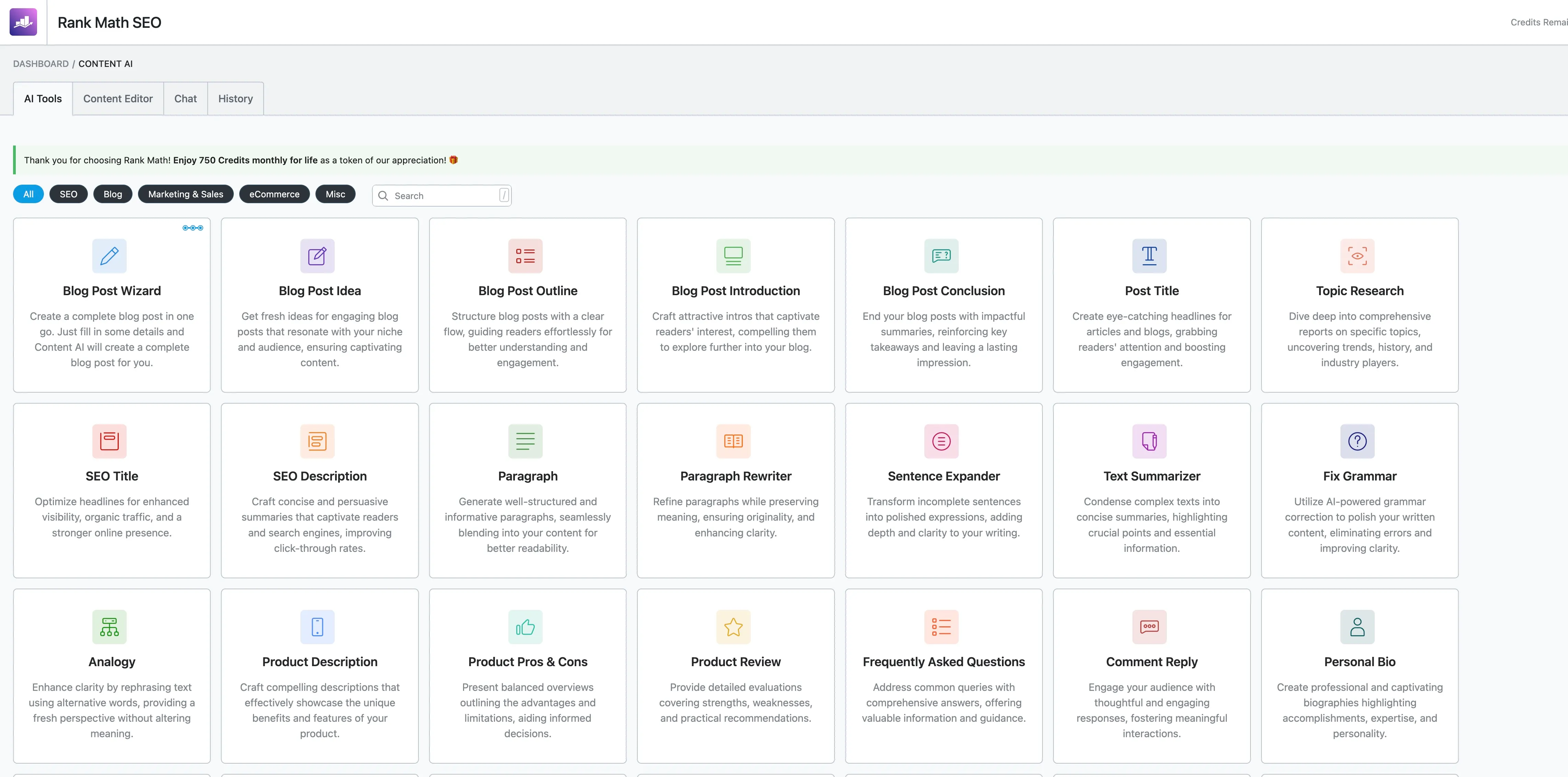 Rank Math has a habit of promoting its premium features and Content AI credits through dashboard notifications. It is not aggressive by WordPress plugin standards, but if you are the type who keeps a clean admin area, the upsell prompts will annoy you.