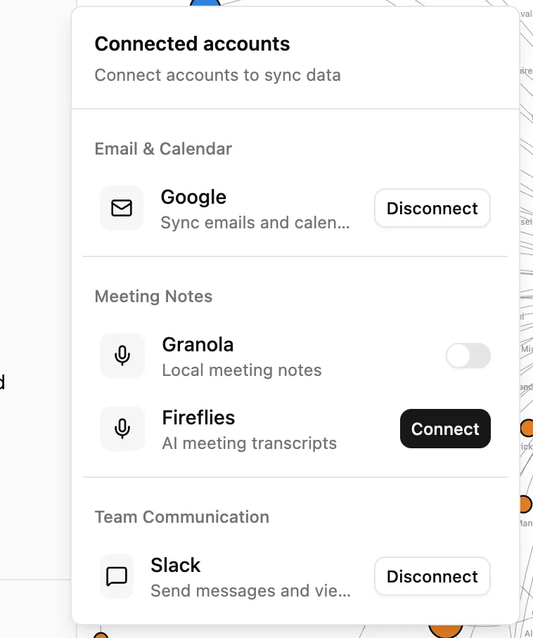 Meeting Notes: Connects to Granola (5 minute sync) or Fireflies (30 minute sync) for meeting transcripts. If you use either of these tools, the integration means your meeting context flows automatically into the graph.