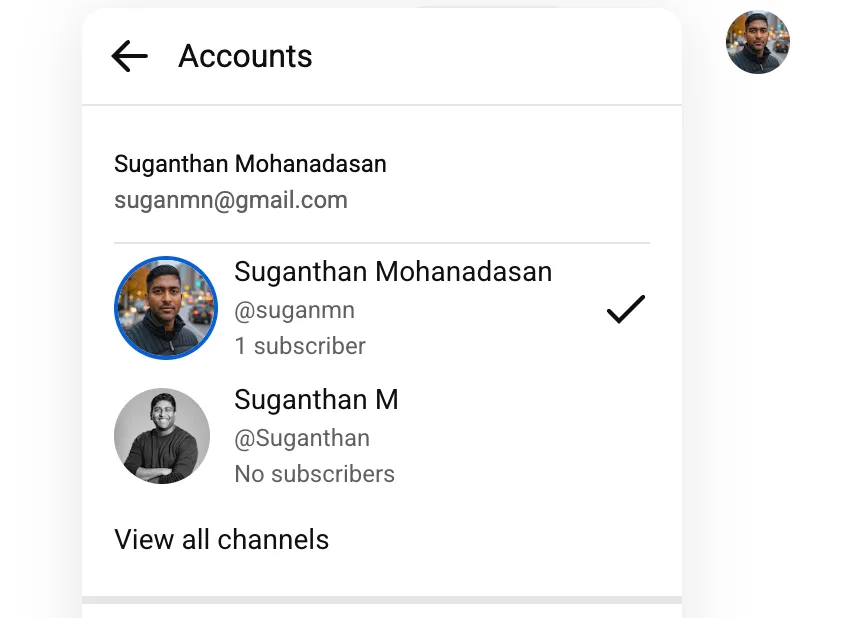 I have two YouTube channels under the same Google account. One is my main personal channel. The other is a Brand Account I’d set up years ago. The Brand Account held the handle I actually wanted: @suganthan. My real name. My identity across every platform. My website. My Google Knowledge Panel. The whole thing.