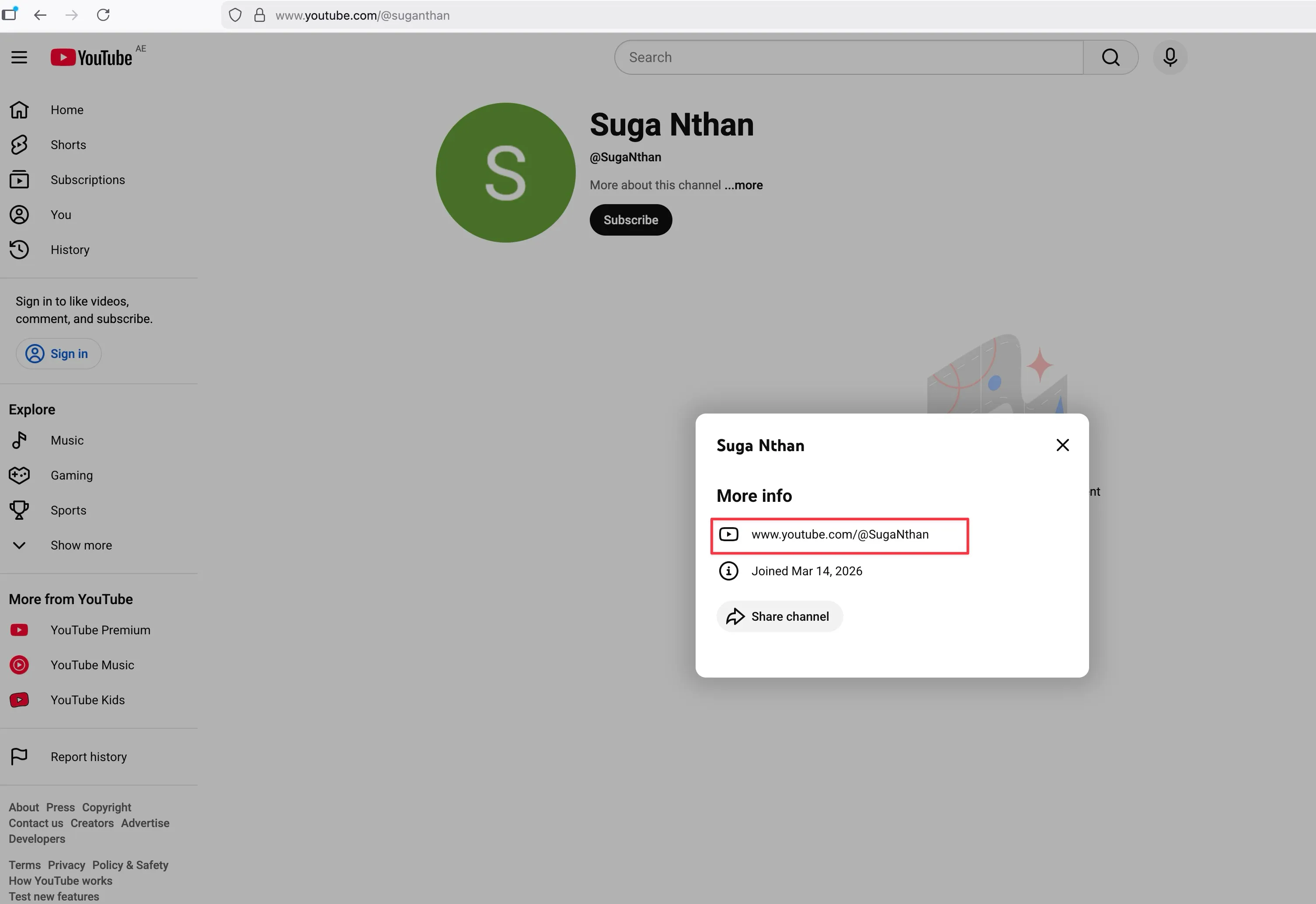 As of writing this, the bot channel “Suga Nthan” is still sitting at youtube.com/@suganthan with zero videos and zero subscribers. It has done nothing. It will do nothing. It exists purely because an automated script was faster than me by a fraction of a second.
