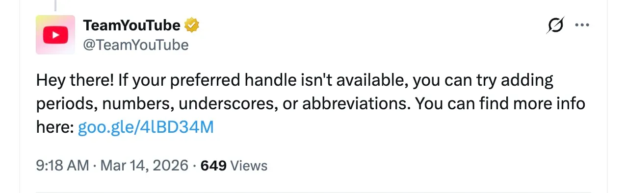 Treat handle squatting as a policy violation. A channel with zero content that exists solely to sit on a sniped handle is, by any reasonable definition, spam. YouTube’s own policies should cover this.