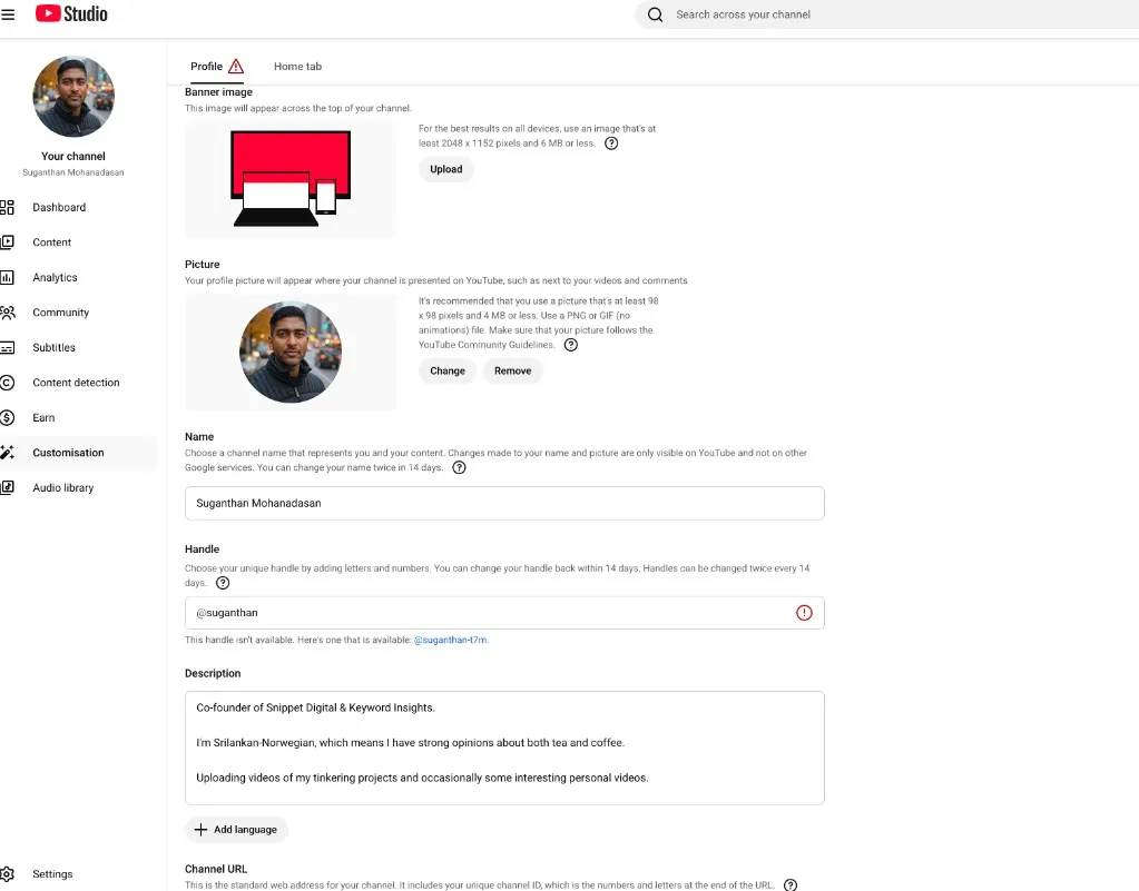14 March 2026: The 14 day waiting period ended. I’d been patient. I’d done everything right. I opened YouTube Studio, navigated to my main channel, typed in @suganthan, and… error. The handle wasn’t available. I believe YouTube’s system still had some kind of cache tied to the Brand Account. The 14 days had passed, but the system hadn’t fully let go.