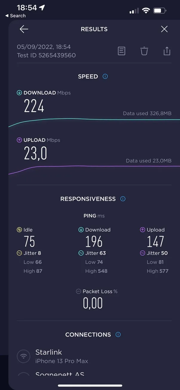 This isn’t my first Starlink. I ran one back in Norway in 2022, and it was solid for the time. 224 Mbps down, 23 Mbps up, which was impressive for a satellite dish sitting on a rooftop in Stavanger.