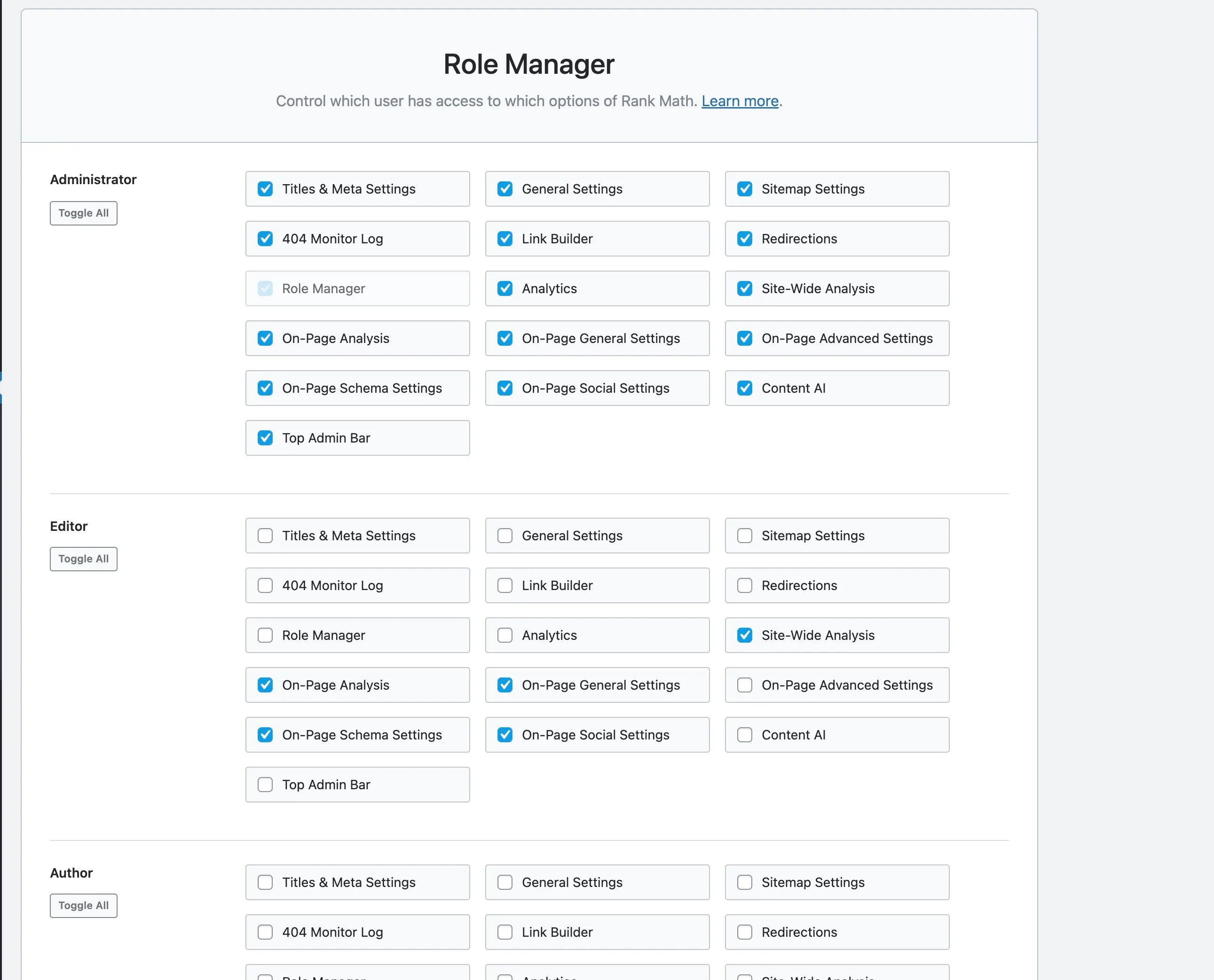 The Role Manager is still a killer feature. I called it one of my favourites in 2019 and that hasn’t changed. Being able to control exactly which Rank Math features each WordPress user role can access is something most competing plugins still don’t offer properly. If you have a team of content writers, this alone justifies the switch.